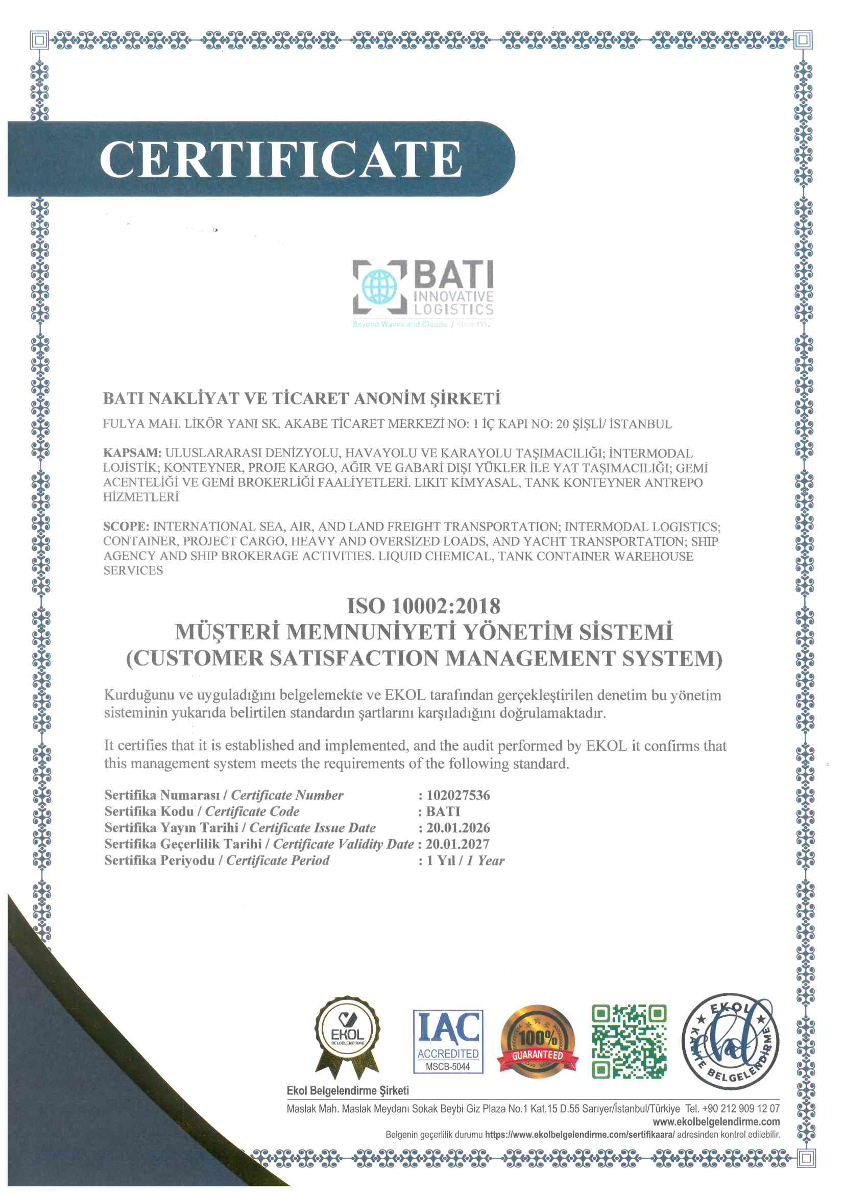 Müşterilerimizin BATI’yı tercih sebepleri sadece uygun fiyat ve servis kalitesi olmayıp, şirketimizin kendilerine göstermiş olduğu saygı, çözüm ortaklığı, dürüstlük, içtenlik ve samimi bir şekilde sözümüzün arkasında durmasıdır. BATI olarak da müşterilerimizin güvenebileceği bir şirket olmak adına çalışmakta ve bu da bizim başarımızın odak noktasında büyük bir rol oynamaktadır. Firmamızın çalışma hayatı boyunca müşterilerine taahhüdü, yüksek etik standartlarda servis sunmaktır.